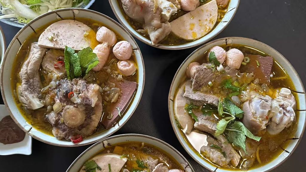 TasteAtlas also recommends several must-visit spots to enjoy authentic bún bò Huế, notably the Đông Ba Market area, where the soup is cooked using traditional recipes. The broth there is rich and flavorful, the beef tender and sweet, served with scallions, fresh vegetables, and mắm ruốc (fermented shrimp paste), offering a deeply local dining experience reminiscent of the former imperial capital.